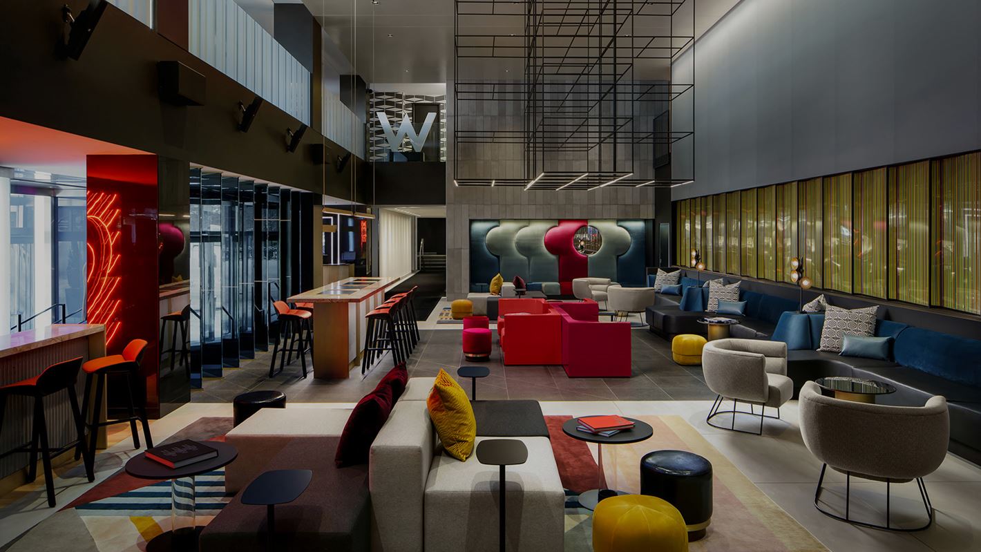 W Montreal recently underwent major renovations to its common areas, including the check-in area, lobby, bar and restaurant, as part of a multi-phase repositioning project aimed at updating the banner’s identity and offering. Developed by the firm in 2017, the driving concept boasts museum-style décor inspired by Montreal’s cultural icons, and features revisited artifacts that reflect a forward-thinking city that takes pride in its heritage. Here, we find bespoke metro station furniture; carpets hinting at street art; suspended lighting fixtures inspired by the shape of the cross atop Mount Royal; and illuminated artwork reminiscent of the Quartier des Spectacles and red-light district. The bar bridges the gap between the lobby and the restaurant. Located above a former bank vault, it is a massive block adorned in gold. The Tbsp. restaurant sits in a port-like atmosphere surrounded by azure marble, with a shimmering, wavy ceiling that recalls the St. Lawrence River.