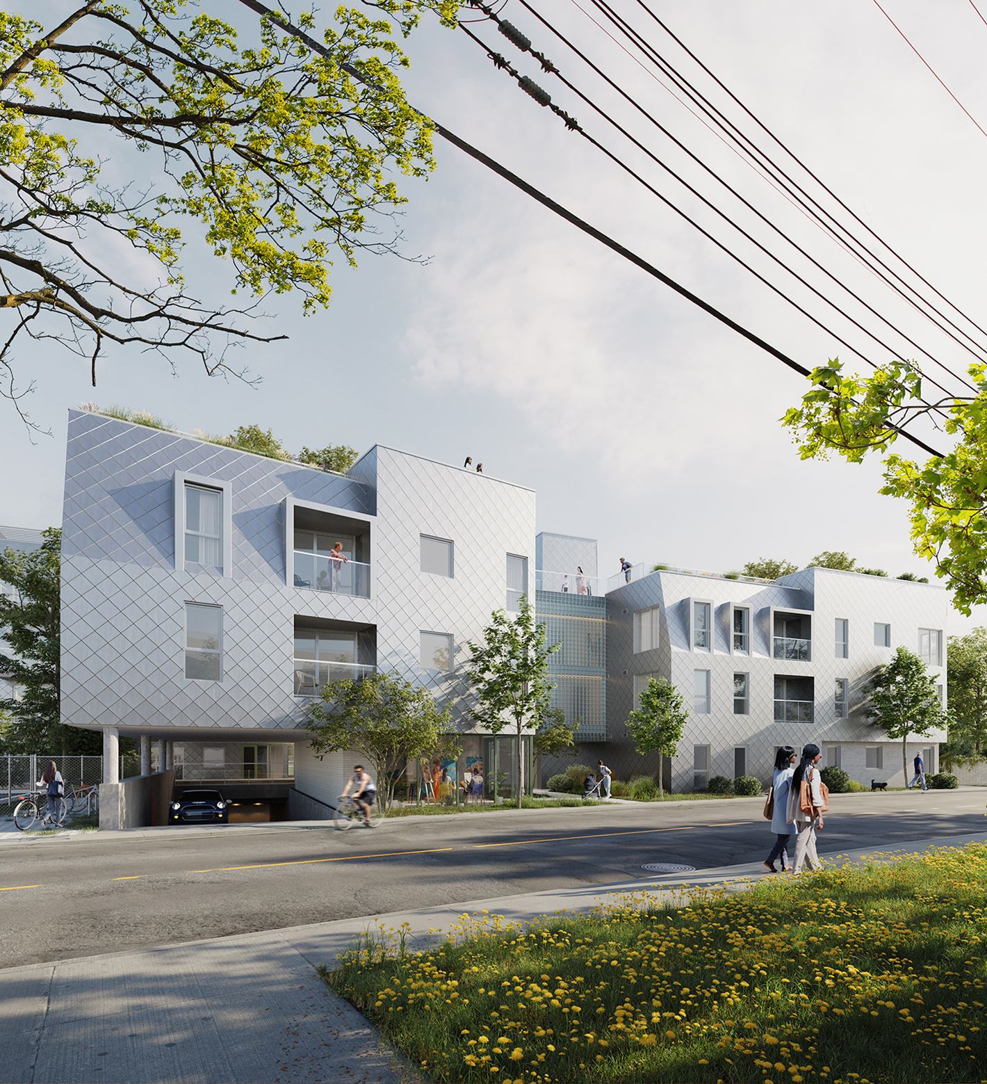 At the heart of the project, the common house takes center stage, offering residents welcoming gathering places, shared services, and abundant opportunities to connect. Drawing inspiration from Lachine’s landscape and identity, the architecture adopts a pavilion-style layout that blends seamlessly into the urban fabric. A thoughtful transition in building heights and a reinterpretation of mansard roofs reflect the neighbourhood’s character, while glassed-in walkways link the volumes, maximizing natural light and incorporating local materials.